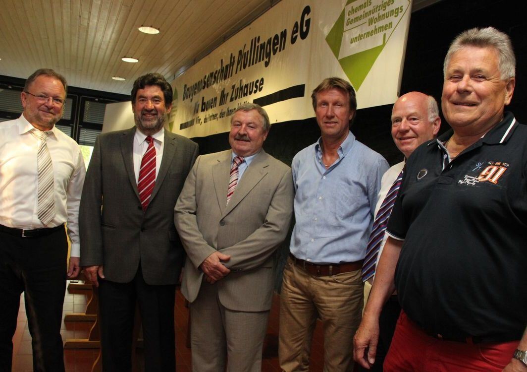 Während Werner Kalla (rechts) von Hans-Ulrich Kiefer, Norbert Rupp und Günther Schneider (von links) aus dem Aufsichtsrat verabschiedet wurde, wählten die Mitglieder der Baugenossenschaft Thomas App und Uli Keppler (2. und 3. von rechts) in das Gremium. FOTO: LEISTER