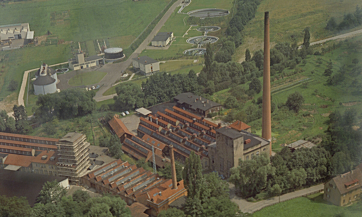 So grün war’s 1966 entlang der Pfullinger Römerstraße. Sie trennt auf der Luftaufnahme kaum sichtbar, das gemeinsame Klärwerk von Pfullingen, Eningen und Lichtenstein vom Areal der Textilfirma Leuze. Heute stehen hier OBI und Marktkauf. FOTO: BURGEMEISTER