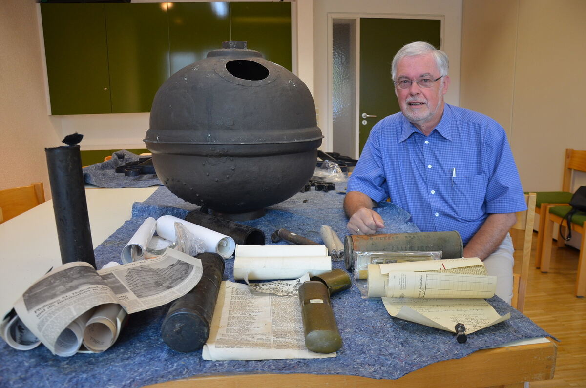 Kirchengemeinderat Helmut Schwarz präsentiert den Inhalt der Kugel, die vor Kurzem vom Turm der Martinskirche heruntergeholt worden ist.