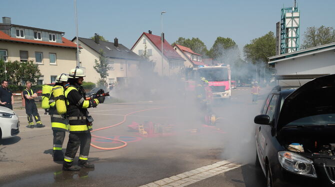 Wie ein brennendes Elektro-Auto löschen? Das übten die Einsatzkräfte mit einem realistischen Szenario am Samstag vor dem Pfullinger Feuerwehrhaus: Der Rauch war künstlich, das Wasser echt.