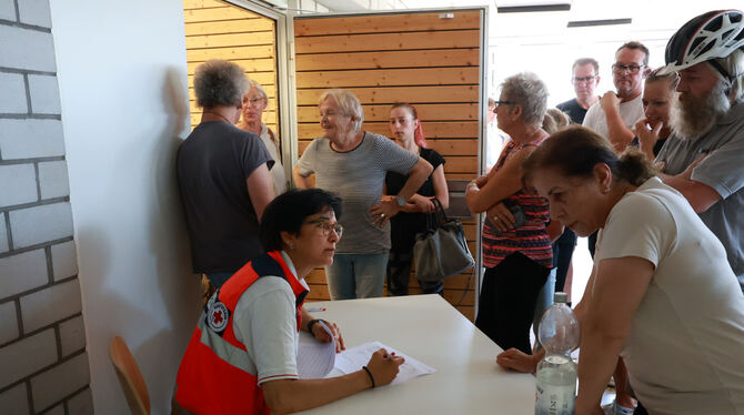 Um 13 Uhr informiert Beatrice Herrmann in der Greifensteinhalle rund 70 Menschen, darunter einige Kinder, über die Situation. Sie hören alle aufmerksam zu. Das DRK Lichtenstein sorgt für Speis und Trank. Es gibt Spaghetti mit Tomatensoße und Getränke.