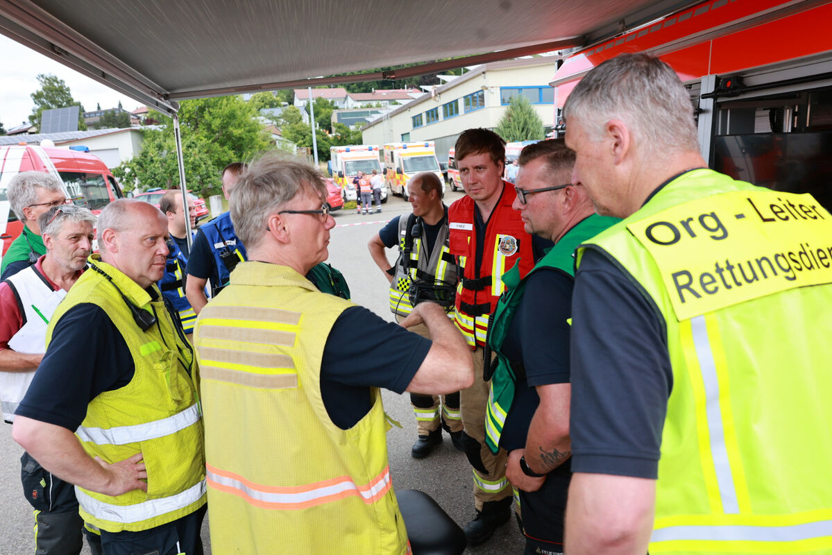 Es ist 14.22 Uhr. Für die Rettungskräfte beginnt die kritische Phase. Die Anspannung ist spürbar. Es wird stetig die Temperatur gemessen, es wird weiter gekühlt. Sie erhöhen die Anzahl der Wasserwerfer auf drei. Da geht jeweils pro Minute 1.500 Liter Wasser auf die Gasflasche. »Das warme Wetter macht uns einen Strich durch die Rechnung«, sagt Wolfram Auch. Es heißt warten. Allen Rettungskräften ist die Situation bewusst. Sie wissen, dass in der Greifensteinhalle rund 100 Menschen sehnlichst auf ein Ende warten. Aktuelle Informationen überbringt ihnen Ordnungsamtsleiterin Kerstin Jungel, weil Herrmann sich am Einsatzort aufhält.
