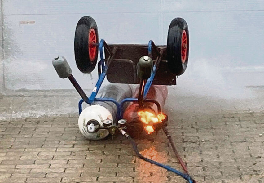 LICHTENSTEIN-HOLZELFINGEN. Um 9.29 Uhr geht der Alarm. Gasflaschenbrand in der Kornbergstraße in Holzelfingen. Die Lichtensteiner Feuerwehr rast, so berichten es Augenzeugen, mit Höchstgeschwindigkeit ins Industriegebiet. Die Flasche liegt vor der Werkstatt am Boden und brennt mit einer kleinen Flamme. Höchste Gefahr.