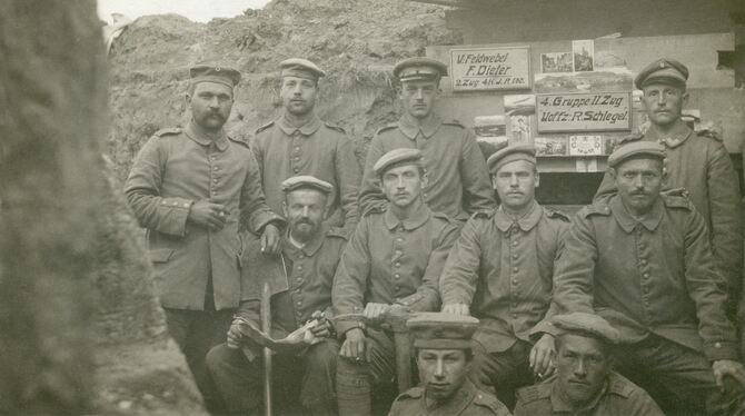 »Meiner 1. Freundin zum 25. Geburtstag in treuer Freundschaft nachträglich gewidmet. Gute Nacht! Bleibe gesund.« So lautet der Text einer Feldpostkarte eines Richard Schlegels vom 10. November 1915. Das Foto entstand während der Stellungskämpfe nördlich des französischen Thiepval.