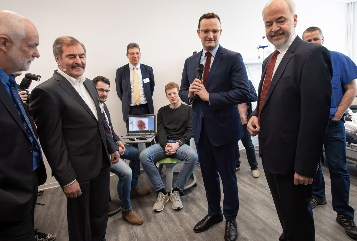 Das Programm Telederm ermöglicht, dass Dermatologen der Uniklinik Tübingen aus der Ferne beurteilen, ob eine Hautveränderung harmlos ist oder weiterer Untersuchung bedarf. Beim Besuch von Gesundheitsminister Jens Spahn (Zweiter von rechts) führten Vertreter der Kreiskliniken und Landrat Thomas Reumann (rechts) den regionalen Beitrag zur Telemedizin vor. FOTO: TRINKHAUS