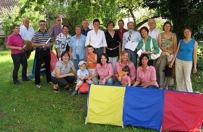 Gruppenaufnahme im großen Garten hinterm Haus: der Gemeinderat mit Betreuerinnen und Kindern der Kleinkindergruppe in der Marktstraße sowie Mitgliedern des Vereins »Wilde 13«.