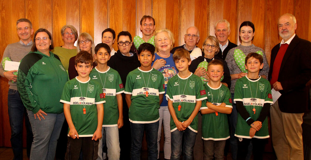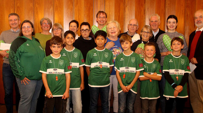 Spendenübergabe der Aktion »Fußballkids helfen«: Vertreter der begünstigten Vereine und Institutionen mit Fußball-Kids, den Organisatorinnen Melanie Seibold (Zweite von links) und Dr. Barbara Dürr (Mitte, blaues T-Shirt). FOTO: LEIPPERT