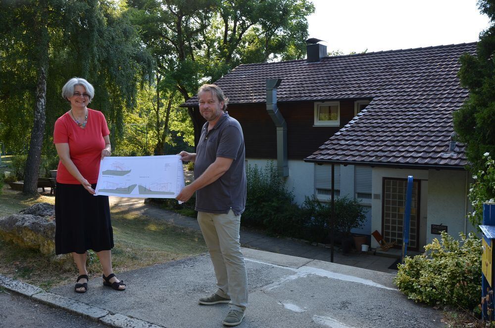 Karin Jeromin und Architekt Alf Hagmaier mit den Umbauplänen vor dem CVJM-Freizeitheim Brönnlensteich. GEA-FOTO: SCHÖBEL