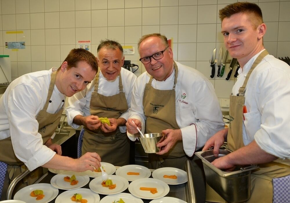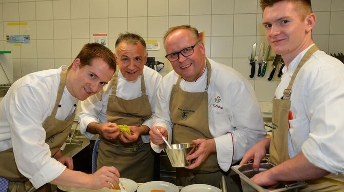 PFULLINGEN. Ungewöhnlicher Dank für eine ungewöhnliche Leistung: Rund 100 Mitglieder der Kochteams am Pfullinger Friedrich-Schiller-Gymnasium (FSG), die täglich bis zu 400 Mahlzeiten auf die Teller bringen, wurden am Montagabend von den beiden Spitzenköchen Gerd Windhösel aus Erpfingen und Claus-Peter Lumpp aus Baiersbronn mit einem fünfgängigen Menü in der FSG-Mensa verwöhnt.