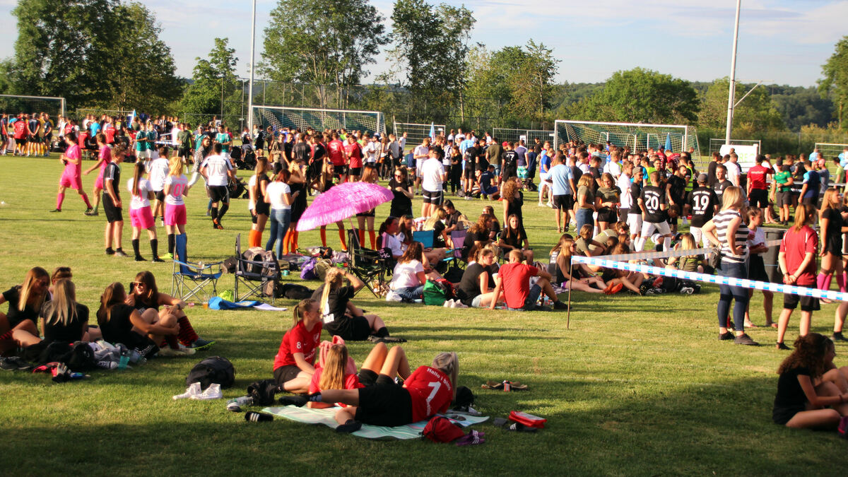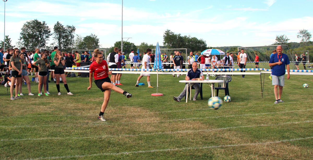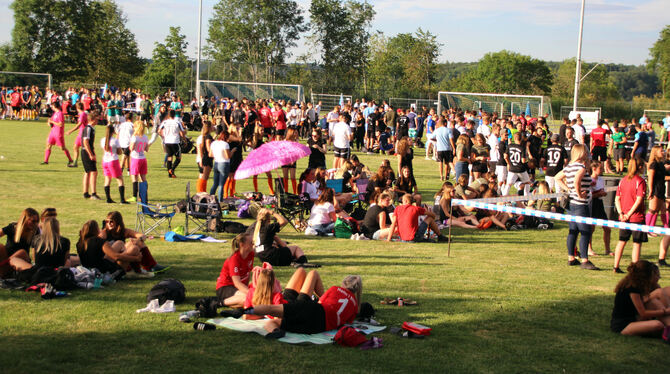 »Bei den Herren gab es sogar wieder eine Warteliste«, erklärte Marcel Bradl vom Orga-Team. »Nur die Anmeldung bei den Damen war zum ersten Mal ein wenig schleppend«, ergänzte Turnierleiter Benjamin Brändle. Perfektes Abendwetter mit angenehmen 25 Grad und strahlendem Sonnenschein sorgte für richtig gute Laune bei den zugelassenen 112 Herren-Mannschaften und 12 Damenteams. Und wie jedes Jahr fielen viele durch teils absonderliche Namen auf. Da spielten die »Trinkerbells« gegen »Der Klügere kippt nach« oder die »Schluckspecht Schoschonen« gegen den »FC Schiaß daneba«.