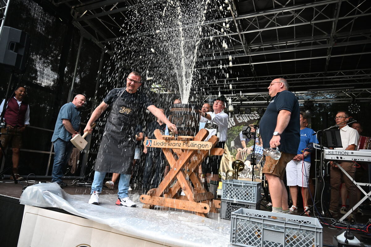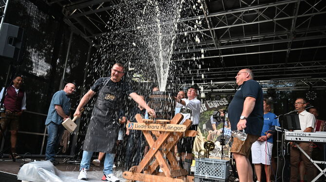 PFULLINGEN. Er hat es wieder getan. Pfullingens Bürgermeister Stefan Wörner sorgte – wie schon im vergangenen Jahr – für eine ordentliche Bierdusche beim Fassanstich zum Schlösslesparkfest der Gemeinschaft der Musik treibenden Vereine. Nur gut, dass er selber am meisten davon abbekam und damit gleich zum Auftakt des dreitägigen Festes in Pfullingens lauschiger Ecke die gute Stimmung der Besucher noch steigerte.