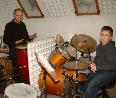 An den Instrumenten: Musikschulleiter Gangolf Merkle und Musikschüler Kevin.