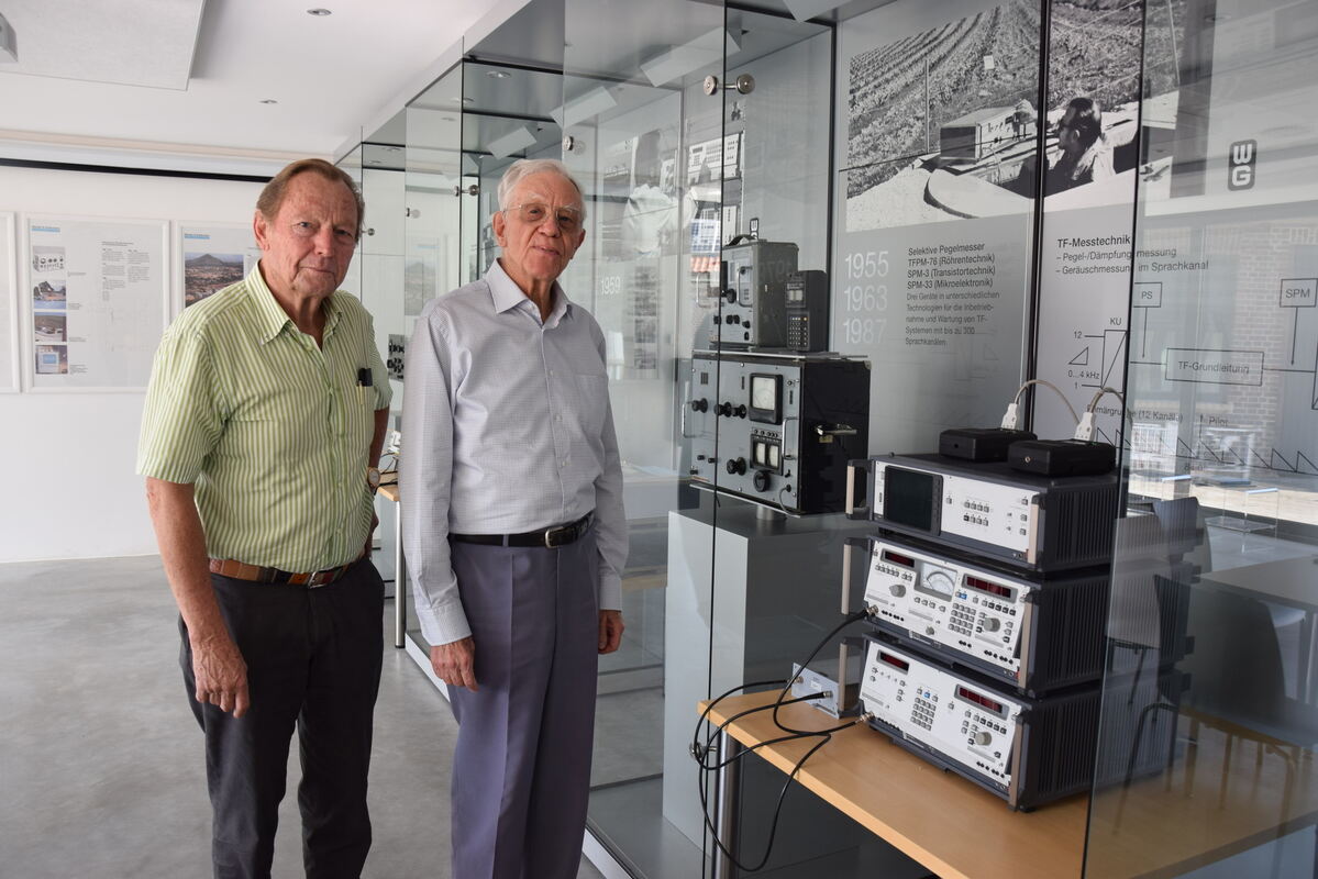 Frank Goltermann (rechts) kurz nach seinem 90. Geburtstag im Jahr 2018 mit Albrecht Wandel im Wandel & Goltermann-Museum in Pfullingen. FOTO: SCHÖBEL