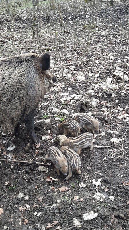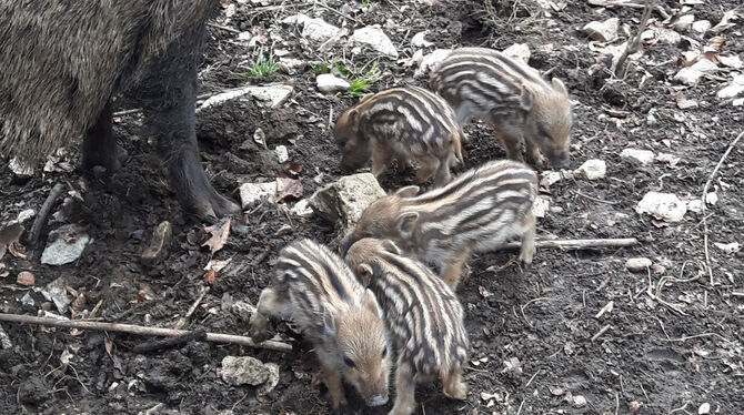 Das Warten hat ein Ende. Seit einigen Tagen gibt es wieder Frischlinge im Wildgehege auf der Eninger Weide. Lange wurde erwartungsvoll auf den dicken Bauch der Bache geschaut – und plötzlich sprangen die kleinen Schweinchen munter in der Sonne. Zuvor hatte die Bache ein Nest aus Ästen, Moos und Blättern gebaut, einen »Kessel«. Wer Glück hat, bekommt die Säule zu sehen, die durch ihre Längsstreifen gut getarnt sind. Die ersten zwei Wochen verbringen die Kleinen mit ihrer Mutter im Nest, drei bis vier Wochen werden Frischlinge gesäugt. (GEA)
