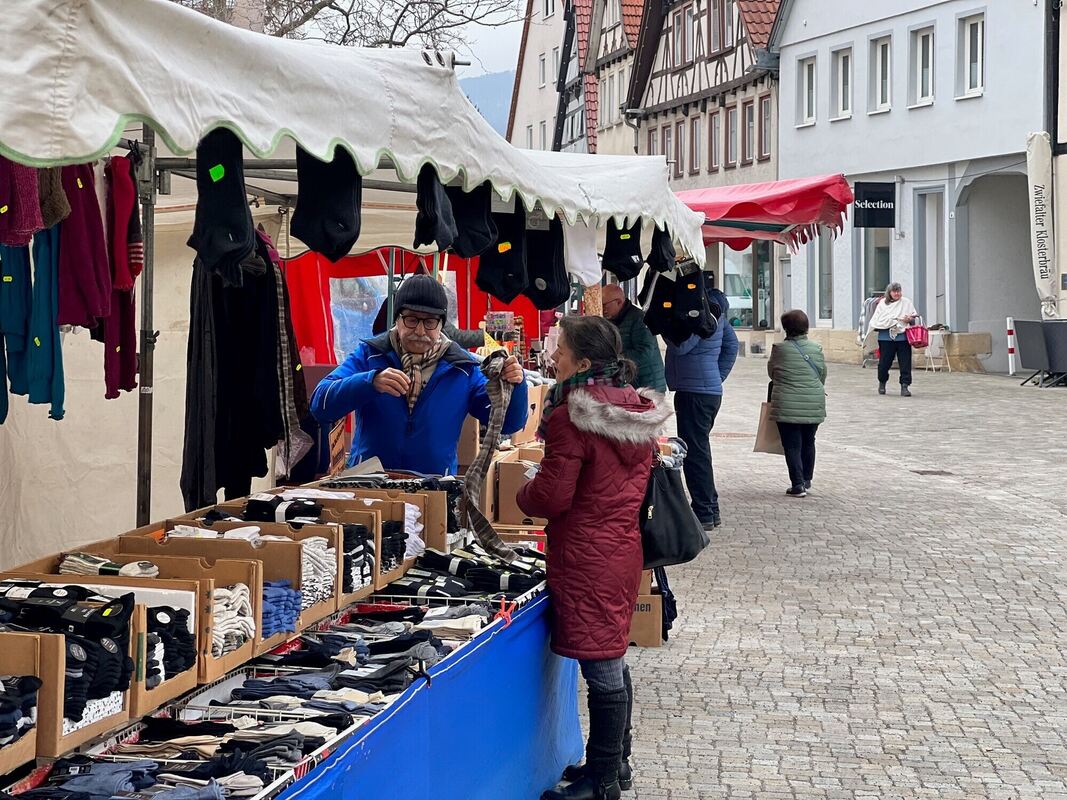 Der Auftakt gestern Morgen war noch verhalten, der ein oder andere Händler fehlte. Die anderen freuten sich aber über den »neuen schönen Platz« und den vielen Raum, den sie jetzt haben. Pfullingen ist eine alte Marktstadt. Schon im 5./6. Jahrhundert, als sich der Alemannenfürst Phulo im Echaztal niederließ, war der Ort Gaumittelpunkt und Gerichtsstätte, was darauf schließen lässt, dass dort auch Märkte abgehalten wurden. 1595 erneuerte Herzog Friedrich die Erlaubnis für fünf Jahrmärkte unter anderem mit dem Hinweis, dass Pfullingen schon seit unerdenklichen Zeiten Wochen- und Jahrmärkte abgehalten habe. Gleichzeitig wurde den Pfullingern verboten, Holz und Frucht – »zur Konkurrenz« – auf die Reutlinger Wochenmärkte zu fahren.