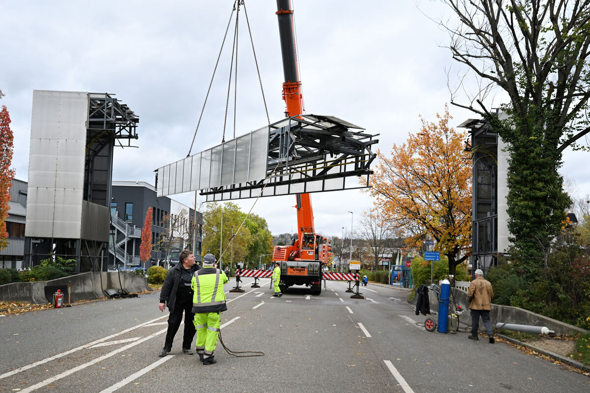 Um kurz nach acht Uhr begannen die Vorarbeiten. Zuerst entfernten Arbeiter Teile der Kunststoffverkleidung, um die schweren Ketten eines 80-Tonnen-Autokrans um die Stahlträger der Brücke zu legen. Dann wurden die Enden der Brücke mit Schneidbrennern von den Türmen getrennt – begleitet von einem Regen aus Funken. Eine hartnäckige Aluminium-Führungsschiene musste zersägt werden. Beim ersten Versuch gelang die Trennung nicht, zu viel Spannung lag auf dem Metall, erklärt Geprägs. Erst nachdem zusätzliche Zentimeter Stahl entfernt waren, schwebte die Brücke langsam am Kran herunter auf die Straße.
