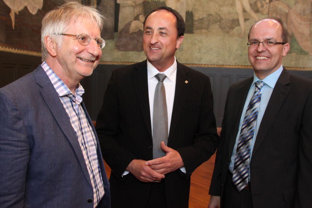 Pierre Stutz (links) beim Osterempfang neben Dekan Hermann Friedl und Bürgermeister Michael Schrenk (rechts). FOTO: LEISTER