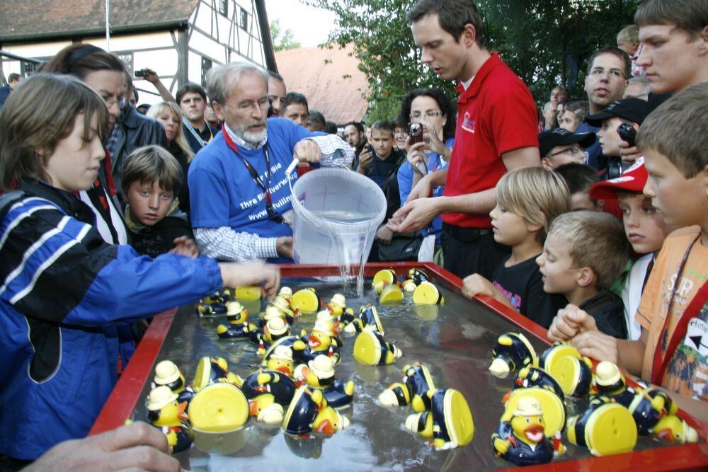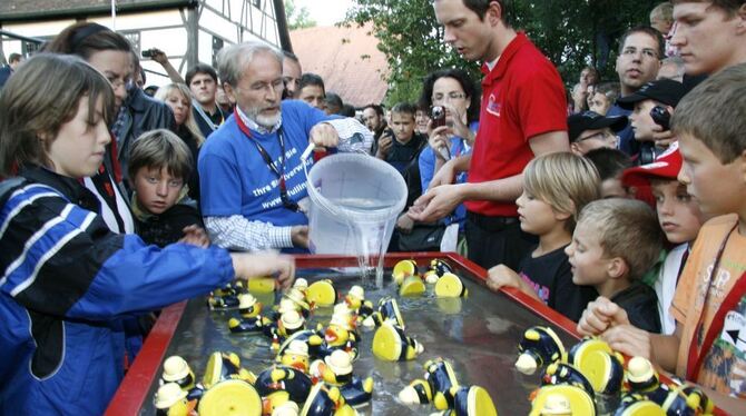Bürgermeister Rudolf Heß hatte seinerzeit den letzten gefüllten Eimer in den Bottich geleert. Jetzt ist der Rekord offiziell anerkannt und bestätigt worden: Die Pfullinger Jugendfeuerwehr hat die längste Eimerkette der Welt auf die Beine gestellt.