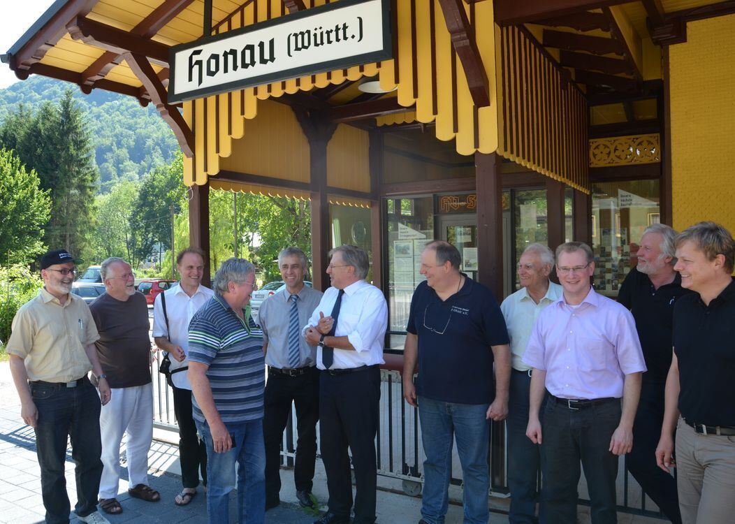 Die Zahnradbahnfreunde Honau-Lichtenstein wollen die restaurierte Originallokomotive wieder zwischen Honau und Engstingen fahren lassen. Im Honauer Bahnhof trafen sie sich jetzt unter anderem mit Regierungspräsident Hermann Strampfer (sechster von links). In dieser Runde ging es um eine mögliche Förderung der Museumsbahn. FOTO: SAUTTER