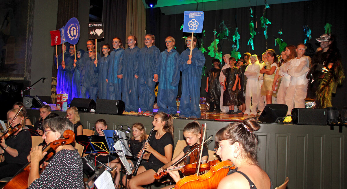 Und schließlich rufen die Kinder so laut sie nur können: »Dafür brauchen wir dich und dich und alle, alle.« Nach kurzer atemloser Stille der Zuhörer wurde dieser grandiose Schlusschor mit frenetischem Applaus belohnt. Kein Wunder, die Chöre hatten mit großer Sangeskraft beeindruckt, die Solisten glänzten mit ungeheurer Spielfreude, couragiertem Auftreten und Textsicherheit, die Musiker imponierten mit sicherem Zusammenspiel, das Schlagwerk durch seine taktgenauen Einsätze. Seit Februar hätten sie intensiv geprobt, erklärte Jochen Rohn, der die Gesamtleitung hatte.