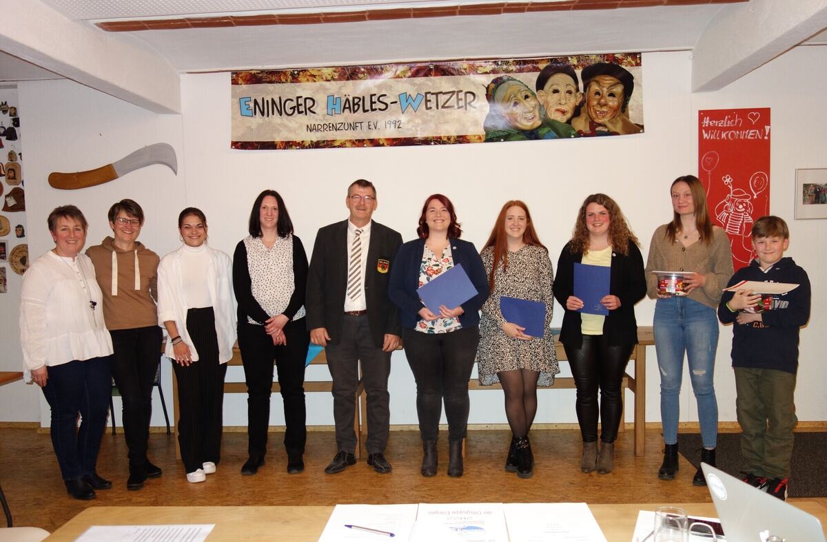 Geehrte und Amtsträger der DLRG Eningen: Nicole Sautter (von links), Birgit Redlich, Elena Redlich, Melanie Baumann-Knies, Hans-Peter Sautter, Kim Laura Sautter, Lea Marie Schweikert, Julia Schäfer, Laura Michelle Knies und Moritz Staiger. FOTO: BOEHM
