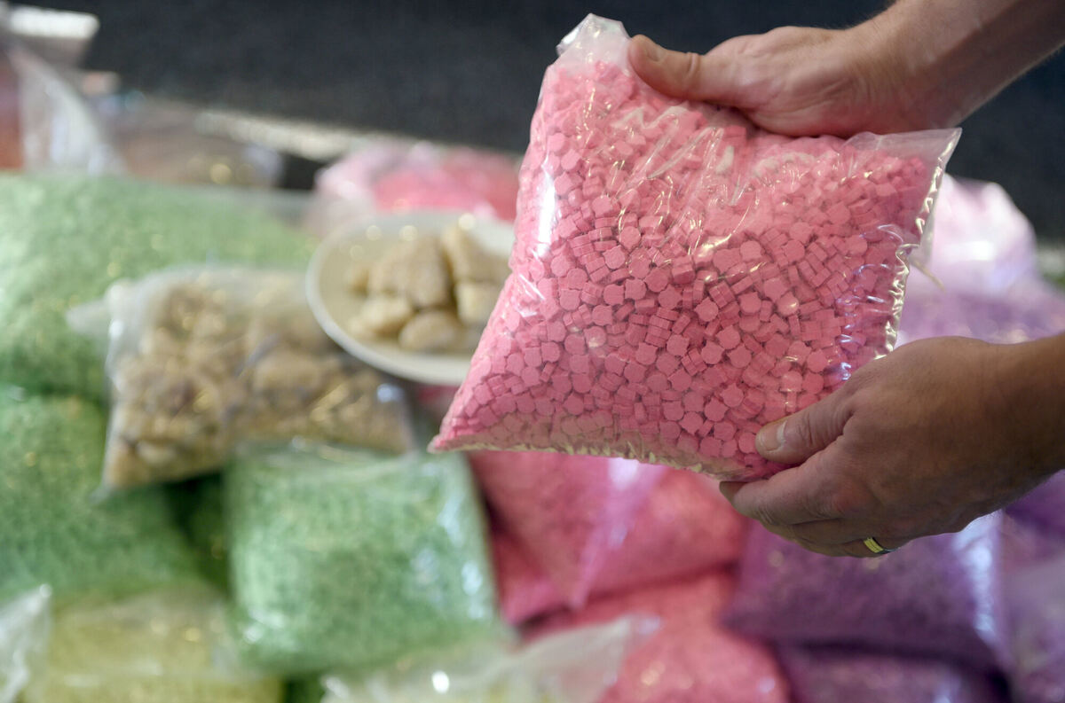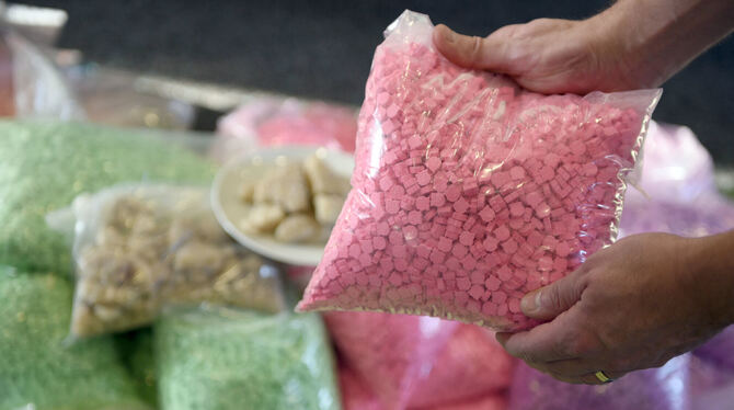 Ein Zollmitarbeiter zeigt in der Generalzolldirektion in Köln bei einer Pressekonferenz Ecstasy-Pillen.