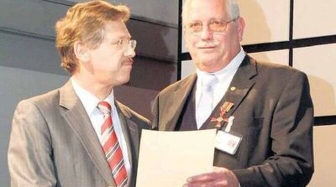 PFULLINGEN. Traugott Feder, der Vizepräsident der Handwerkskammer Reutlingen, erhielt am Freitag anlässlich der Feier zum 75-jährigen Bestehen der Firma Anton Geiselhart das Bundesverdienstkreuz überreicht. Der Reutlinger ist seit Jahrzehnten in der Gewerkschaft aktiv und auch in Berufsorganisationen und -Genossenschaften des Handwerks engagiert. Über 300 Gäste spendeten Feder für seine Arbeit und sein Wirken beim Festakt in der Geiselhartschen »Ziegelhalle« kräftigen Beifall.