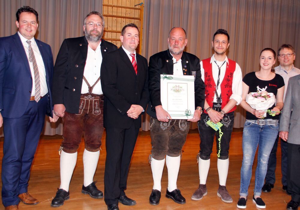 Ehrende und Geehrte: Steffen Haap (Blasmusikverband Neckar-Alb), Andreas Bartz, Vorsitzender Stephan Blötscher, Rolf Goller, Massimo Laraia, Jessica Schmid, Dieter Jetter und Karl März (von links). Foto: Leippert