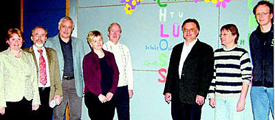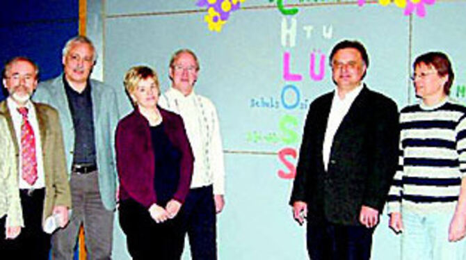 Sprachen über Schulsozialarbeit (von links): Barbara Kiefl (Leiterin des Kreisjugendamtes), BM Rudolf Heß, Wolfgang Straub (Rektor Schloss-Schule), Traude Staiger-Kächele (bei der Stadt zuständig für Schulen), Werner Geiger (Konrektor Schloss-Schule), Hans-Anton Maier und Karl-Heinz Henning (beide Geschäftsführer von "pro juventa), Dietmar Stooß (Schulsozialarbeiter).