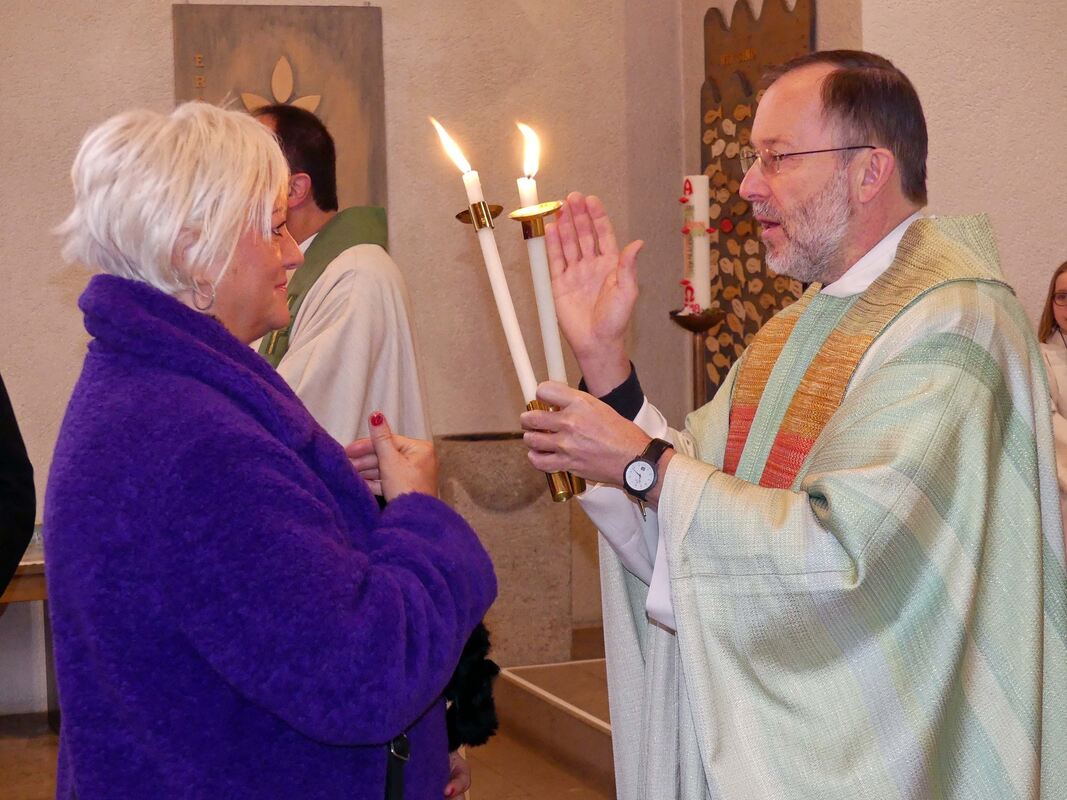 Domkapitular Monsignore Andreas Rieg spendete zum Gedenktag des heiligen Blasius den Blasiussegen, traditionell mit zwei gekreuzten Kerzen. Zuvor hatte er in seiner Predigt in Unterhausen die Gemeinde aufgefordert, ihren Weg auch nach Ende des Wandlungsprozesses »KiamO« (Kirche am Ort) weiter zu gehen. FOTO: DEUSCHER