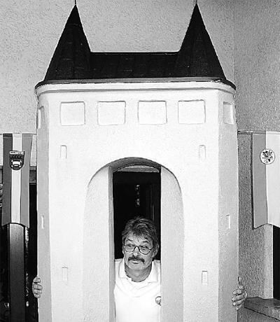 Dieter Erdmann blickt beim Modell des Schönbergturms durch.