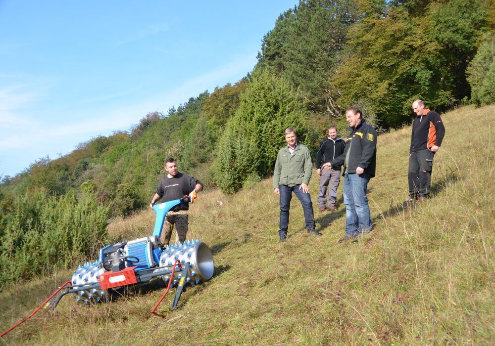 Sicher mähen am Hang: Zur Besichtung der neuen Maschine kam Bürgermeister Peter Nußbaum (zweiter von links). Rechts neben ihm Forstwirt Markus Schaufler, Förster Christian Koch und Forstwirt Sebastian Reinhardt, am Mäher steht Jan-Alexander Pilar.