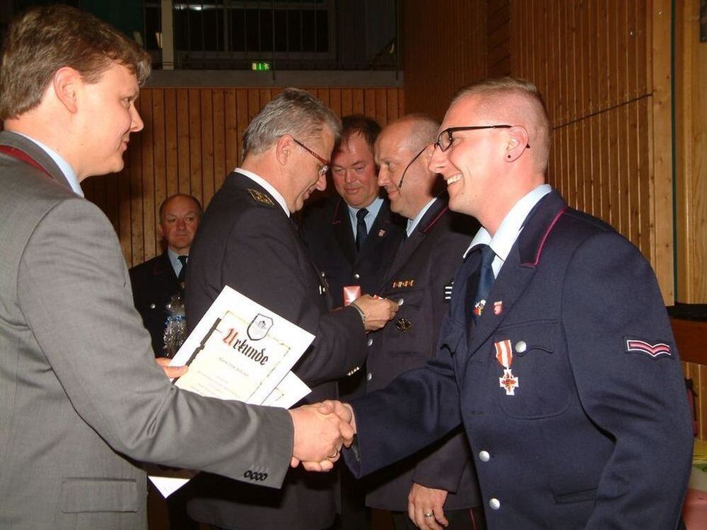 Bürgermeister Peter Nußbaum (links) gratuliert Dirk Böttcher (rechts), dahinter ehrt Harald Herrmann (Mitte) den Lichtensteiner Kommandanten Andreas Daum ebenfalls für 25 Jahre Dienst bei der Feuerwehr. FOTO: KABLAOUI