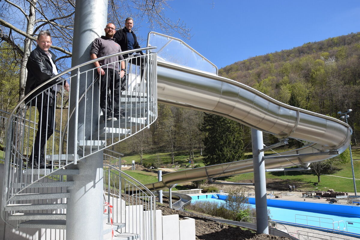 Freuen sich schon auf den ersten Ritt auf der Riesenrutsche (von links): Alexander Schweizer, Fabian Kock und Rainer Klett.