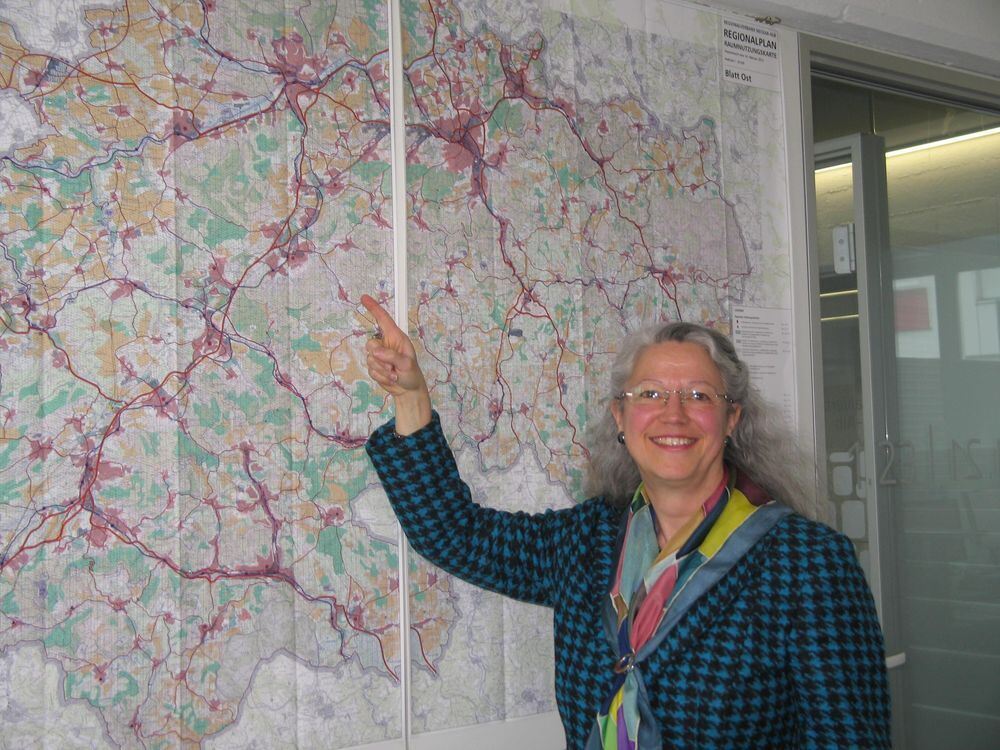 Angela Bernhardt, Direktorin des Regionalverbands Neckar-Alb, vor der Karte, die den aktuellen Stand des Regionalplan-Entwurfs für die drei Landkreise Reutlingen, Tübingen und Zollernalb zeigt. GEA-FOTO: KREIBICH