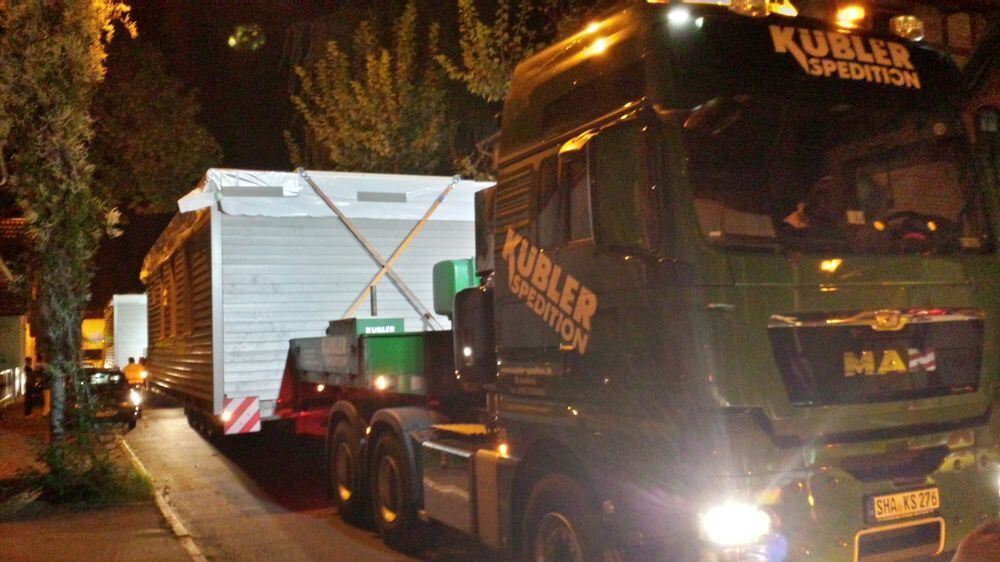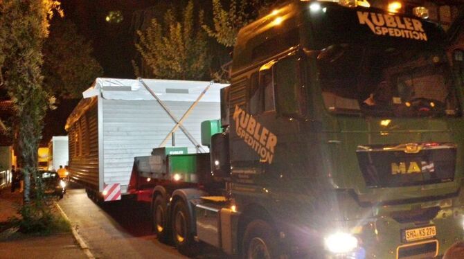 Maßarbeit: Nur wenige Zentimeter trennen den sehr langsam rollenden Schwertransport von den parkenden Autos in der Pfullinger Friedrichstraße. GEA-FOTO: SCHÖBEL