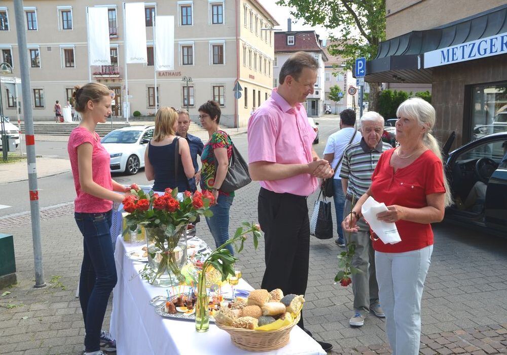 Unterstützt von Tochter Janina (links) und Lebenspartnerin Petra Fuhrmann (links hinter ihm) und mit dem Stand in der Schulzengasse: Bürgermeisterkandidat Alexander Schweizer (im rosa Hemd).