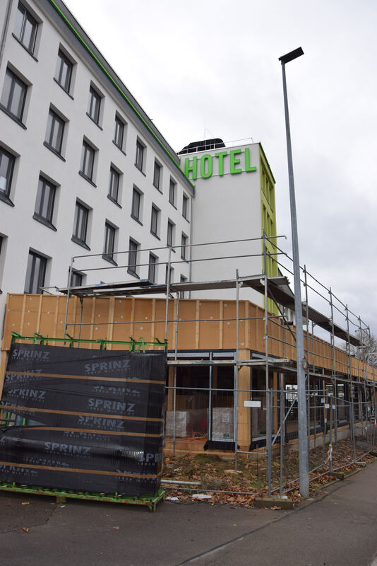 Ende 2018 wurde die Flüchtlingsunterkunft dann wieder aufgelöst, ausgeräumt und zurückgebaut. Der Nutzung als Hotel steht nun nichts mehr im Weg, wie die großen grünen Lettern an der Fassade verraten. Derzeit sind die Handwerker noch mit dem Ausbau beschäftigt.