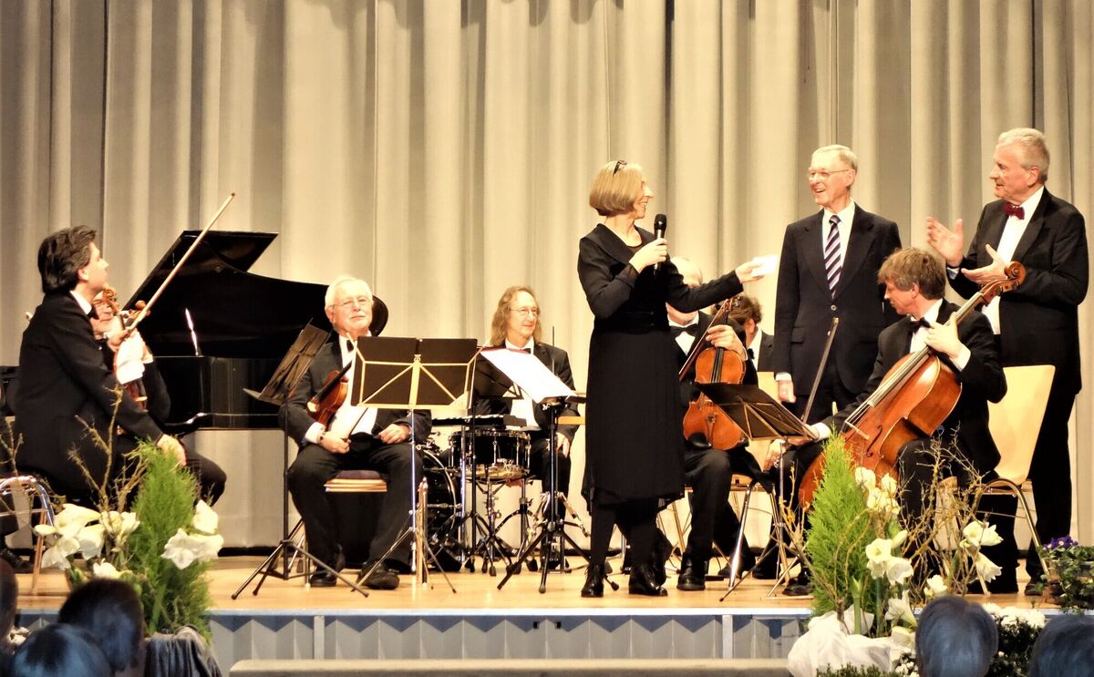 Gemeinderätin Annegret Romer und der frühere Hauptamtsleiter Hans-Otto Christe (stehend Mitte) würdigten während des Neujahrskonzert 2020 die Verdienste von Paul Deppe (stehend rechts). Deppe spielte mit seinem Johann-Strauss-Festival-Ensemble in der HAP-Grieshaber-Halle das offiziell letzte Neujahrskonzert.