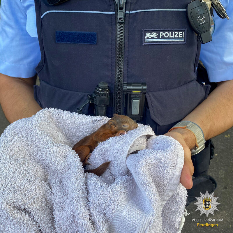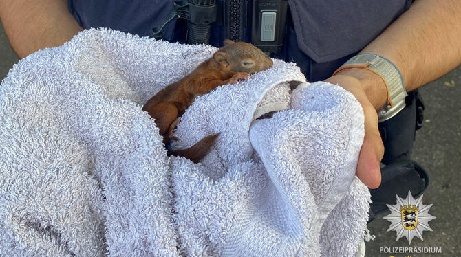 ENINGEN. Ein Sturz aus luftiger Höhe hätte für ein kleines Eichhörnchenbaby in Eningen beinahe böse geendet. Doch weil schnell Hilfe unterwegs war, sieht nun alles nach einem Happy End aus. Aber der Reihe nach: Am vergangenen Samstag ging bei der Reutlinger Polizei ein ungewöhnlicher Notruf ein: Eine Frau hatte beobachtet, wie ein Eichhörnchenbaby nach einem Absturz regungslos auf einer Astgabel eines Baums in ihrem Garten verharrte. Das Tier bewegte sich nicht mehr und schien sich in einer hilflosen Lage zu befinden.