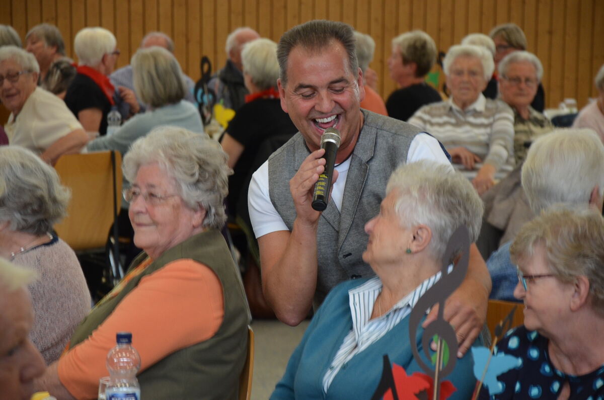 »Sichern Sie sich jetzt ein Autogramm. Wer weiß, was das in zehn Jahren wert ist«, war nicht nur die Macherin des Seniorenaktionstags, Friedlinde Bertsch, sichtlich angetan. Während des rund einstündigen Auftritts schunkelten die Gäste und klatschen kräftig mit. Genauso, wie es sich Bertsch erhofft hatte. Seit 22 Jahren organisiert sie mit Unterstützung der Gemeinde den Seniorenaktionstag, der im zweijährigen Rhythmus »eine gute Mischung aus Unterhaltung und Information für ältere Menschen bietet«, wie Bürgermeister Peter Nußbaum betont. Er durchleuchtete den Haushaltsplan der Gemeinde in seiner Präsentation auf Vorhaben, die für Senioren relevant sind, machte Werbung für das Bürgerrufauto, informierte über die Barrierefreiheit. Danach sorgten die Kinder der Kita an der Echaz mit der Vogelhochzeit für Unterhaltung. Ganz nach dem Motto der Veranstaltung: »Musik liegt in der Luft«.