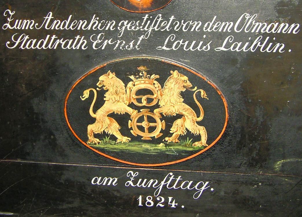 Zunftlade der Pfullinger Bäcker mit Zunftwappen und Stiftungswidmung.