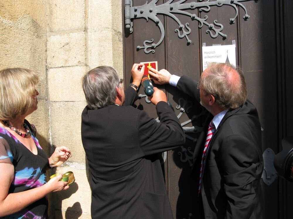 Die Bürgermeister Genaz und Heß (von links) schraubten das Symbol des Martinswegs ans Kirchentor.