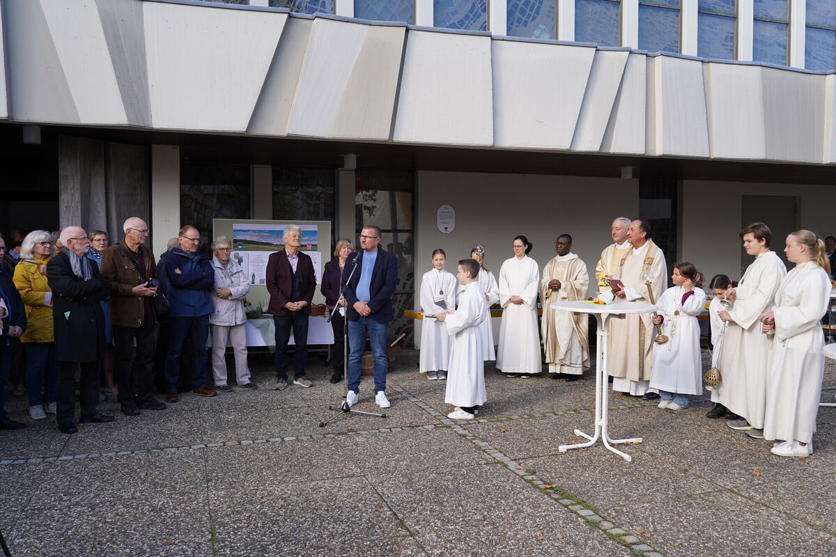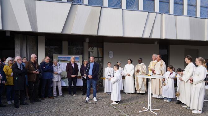 Nach dem Festgottesdienst zum Patrozinium wurde in feierlichem Rahmen die erste Wegmarkierung vor der Kirche St. Wolfgang in Pfullingen angebracht. FOTO: KIRCHE