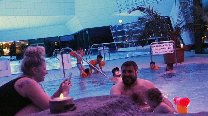 PFULLINGEN. Das hat es hier noch nie gegeben: am Samstagabend lud das Bademeister-Team zum Candle-Light-Schwimmen ins durch Kerzen und kleine Lämpchen in ein schummriges Dämmerlicht getauchte Echazbad ein und rund fünfzig Gäste ließen sich dieses Angebot nicht entgehen. Schon eine halbe Stunde vor dem offiziellen Beginn warteten die ersten Badegäste auf den Einlass.