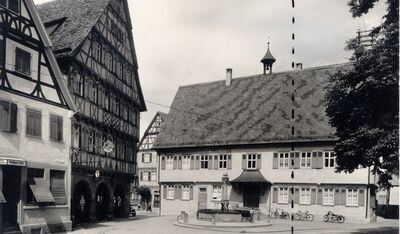 Noch in XXL-Version: Das Rathaus I (rechts) um 1935. Die Strichlinie zeigt, was rechts heute fehlt.