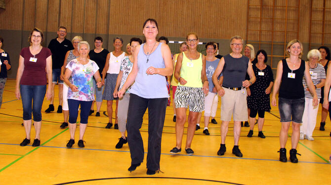 Line-Dance mache ihr an sich schon Spaß, erklärt Petra, die vor einigen Jahren schon mal bei einer Gruppe dabei war. Sehr positiv aufgefallen in diesem Kurs sei ihr, »dass die Iris genau guckt, was wir mit unseren Füßen machen«, so die 64-Jährige. »I probier's oifach mal«, hatte sich Jutta, 72 Jahre, gesagt. »Schließlich ist das ja eine völlig andere Art zu tanzen, wie ich sie kenne.« Dass die Gruppe so bunt gemischt ist, findet die ehemalige Altenhilfe-Fachberaterin des Landratsamtes sehr schön. Sie sei »genötigt« worden zu kommen, so Petras Schwester Sonja, 70 Jahre, mit einem Grinsen. »Dia hend jo denkt, ’s kommet et so viele Leut.«