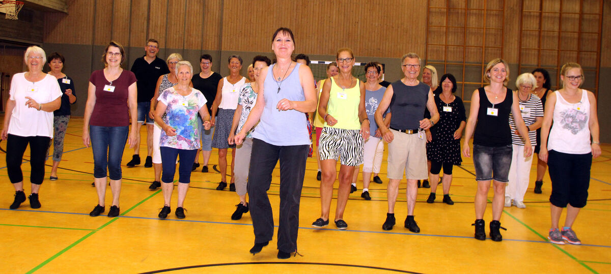 »Wir beginnen mit einem Grapevine rechts«, gibt Funkler nach dem üblichen Aufwärmen ihr Kommando: »Fünf, sechs, sieben, acht« und schon setzt sich die Gruppe in Bewegung. Ein Schritt nach rechts, der linke Fuß kreuzt hinter dem rechten, der macht erneut einen Schritt nach rechts und der linke schließt mit einem kleinen Stampfer.