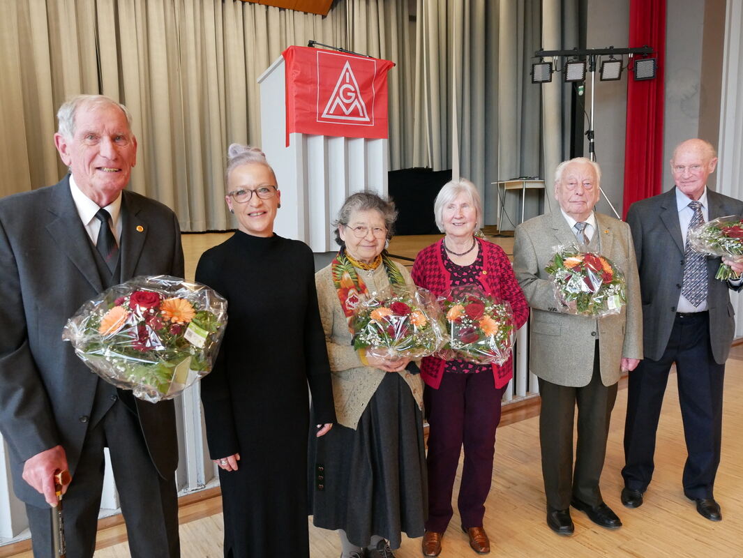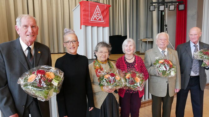 Tanja Silvana Nitschke, Generalbevollmächtigte der IG Metall Reutlingen-Tübingen (Zweite von links), ehrte zusammen mit Michael Bidmon auch die Jubilare Siegfried Vögele (von links), Liese Lemke, Maria Baur, Dieter Mann und Sieghelm Schütz, die alle schon seit 70 Jahren der IG Metall angehören. FOTO: LEISTER