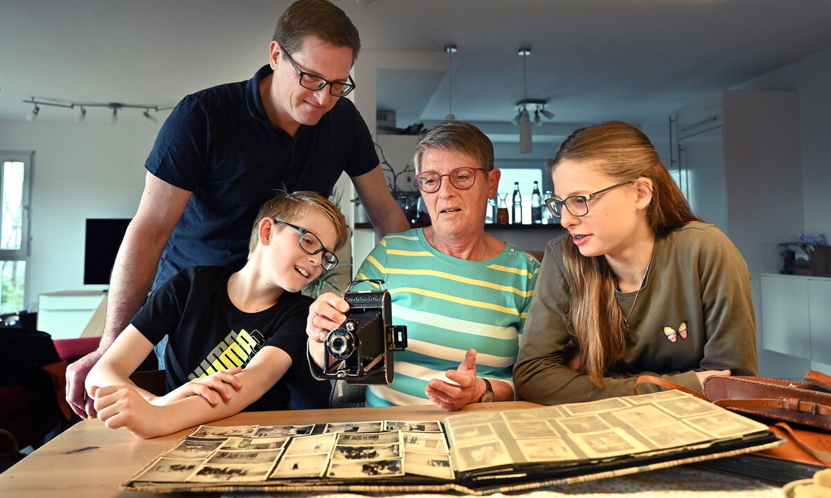 Was für ein Gerät: Marcus (links hinten), Hannes, Margret und Helena Vohrer betrachten mit Staunen einen alten Fotoapparat. Er hat mal der Uroma gehört.